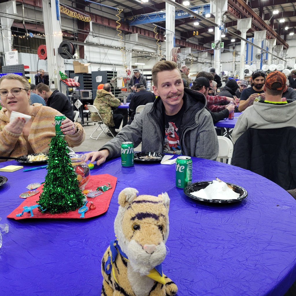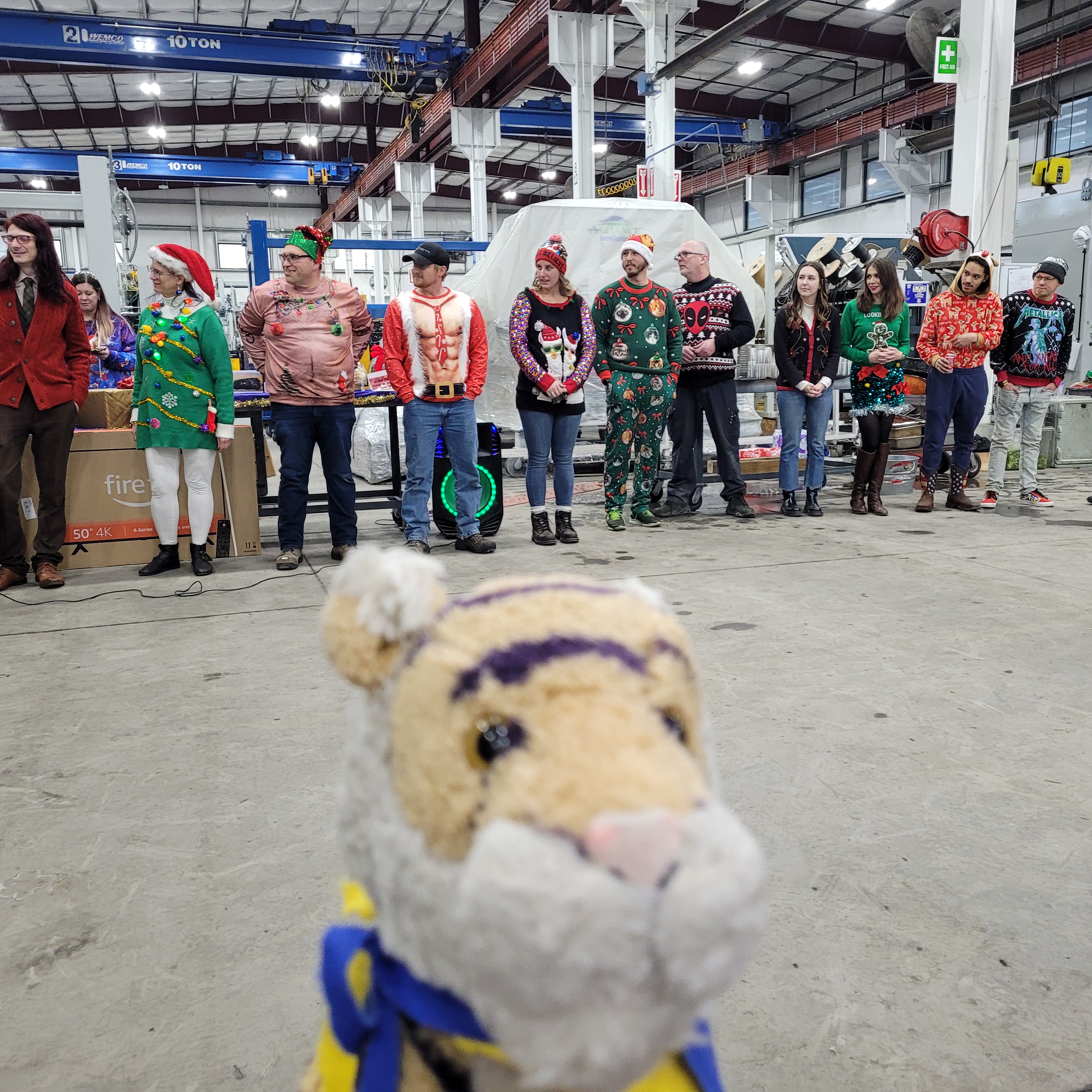 These are some of the contestants in the ugly sweater\festive attire competition. Bennie won, he is near the middle wearing a cat onesie with a cat sweater that lights up.