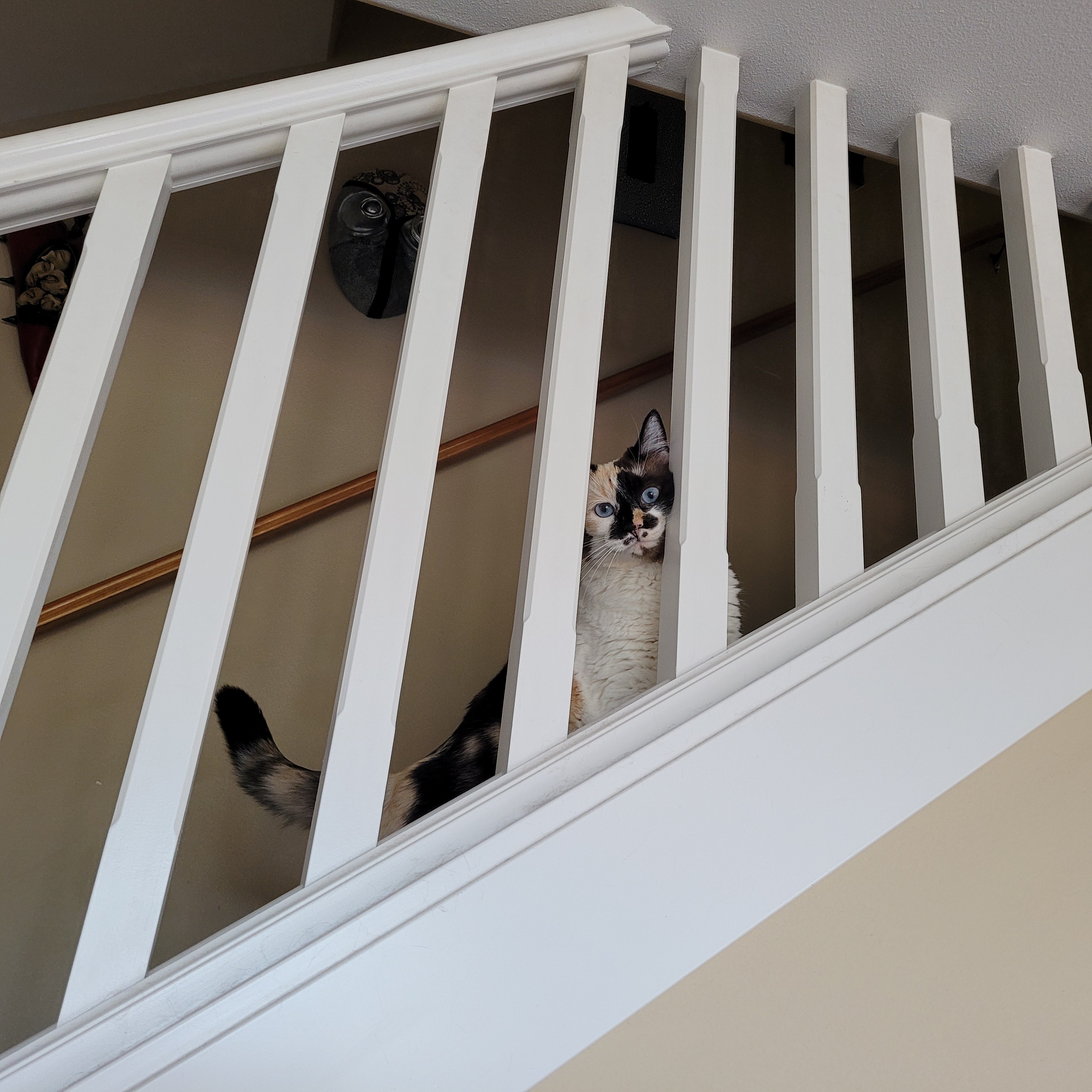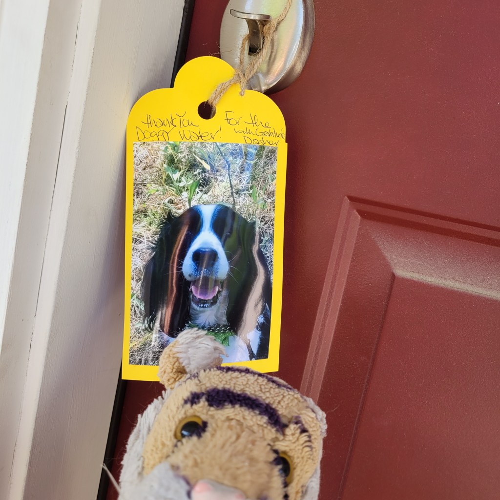 Well. Fixing a broken cabinet hinge turned out to be quite the adventure. It was the cabinet door that we use 100 times a day, the one under the sink. So we cleverly borrowed the hinge from a cabinet we almost never use, which took a while because it did not want to be removed! Then we had to find a replacement for that cabinet and guess what there are none of the right kind in the local hardware stores. So we looked online and guess what they don’t make the exact kind we have anymore. We ordered one that looked like it would work and it took forever to get delivered. Then guess what it did not fit or attach the same way, but we figured out how to use part of the old hinge with part of the new hinge and it is working! We were glad to cross that off the To-Do list!Here is our foster cat Yasmine looking adorable. She is getting braver about exploring.We put out bowls of dog water when the weather gets warm and one day when we came home someone had left a thank you note from their dog Dasher. I love this neighborhood!