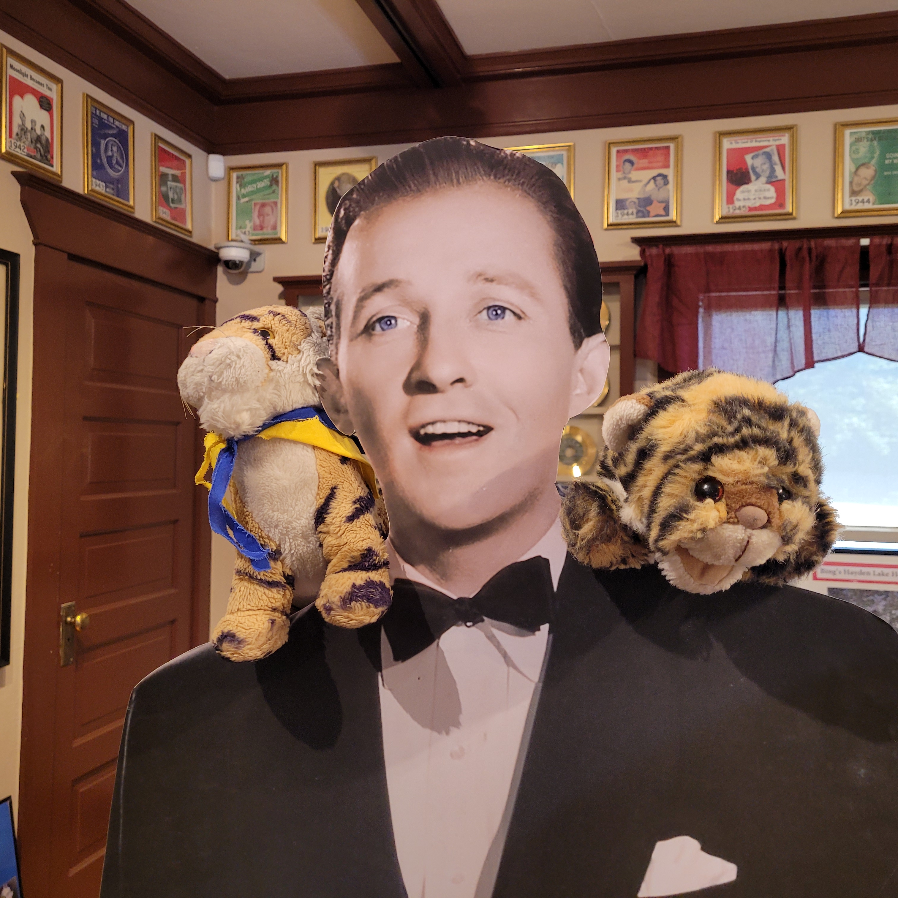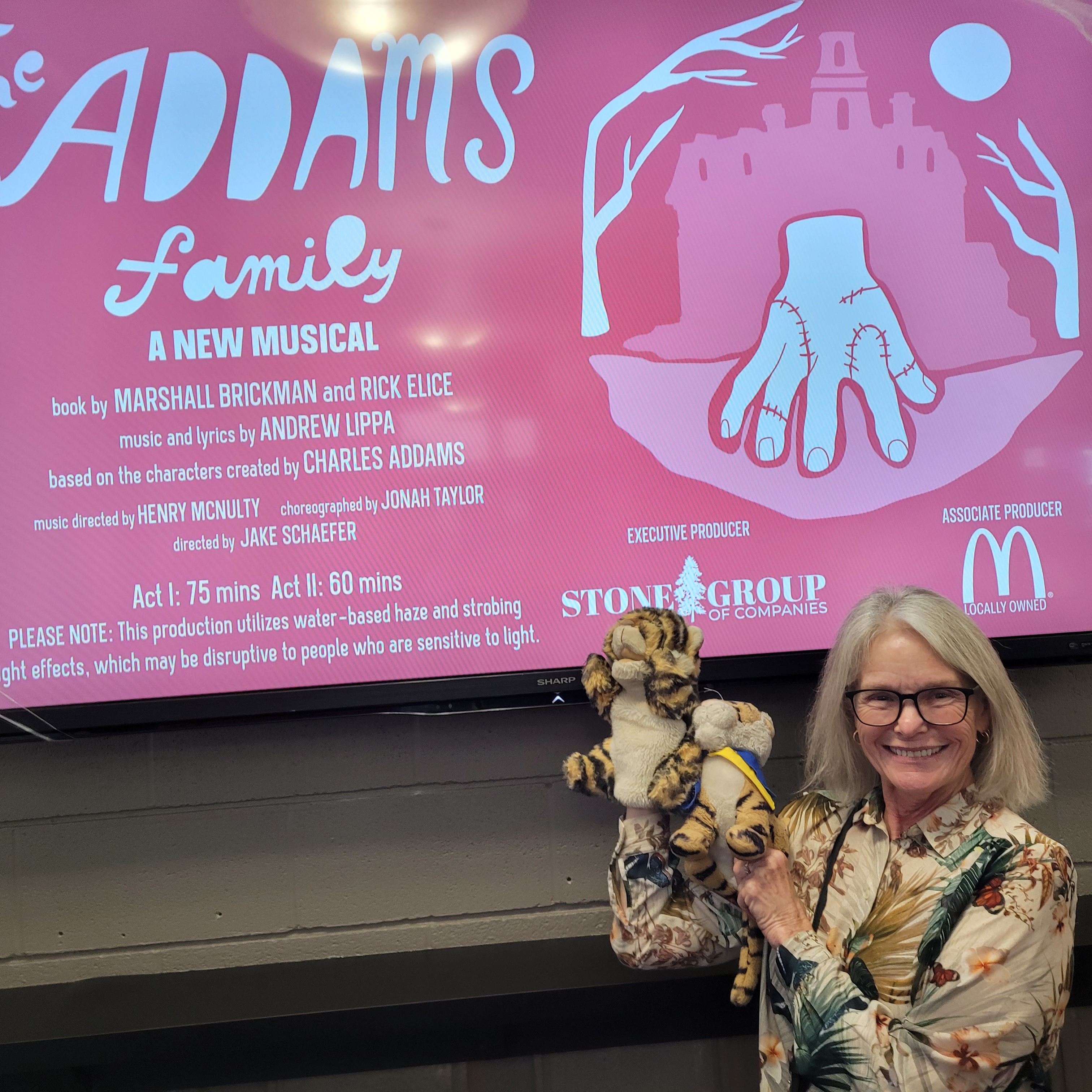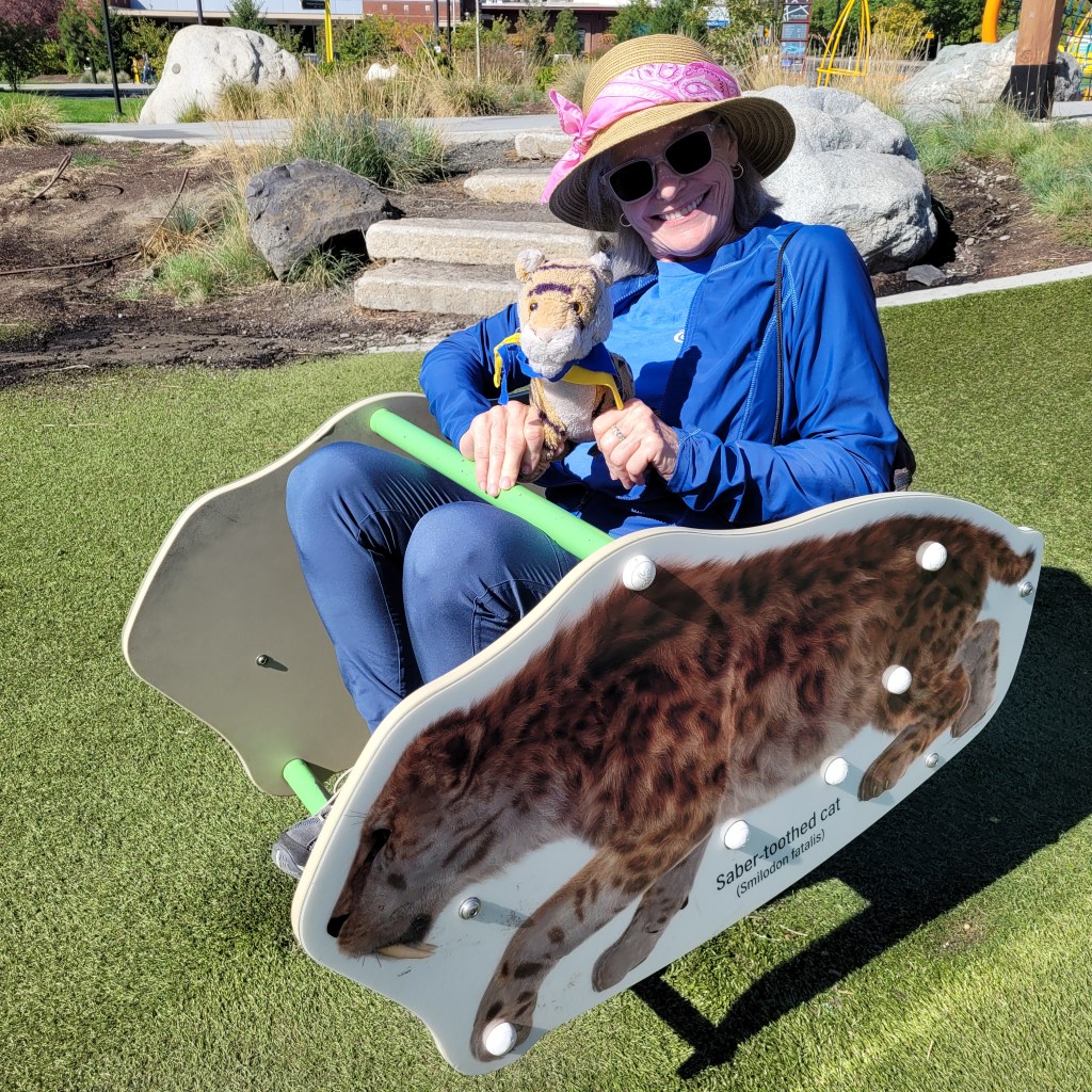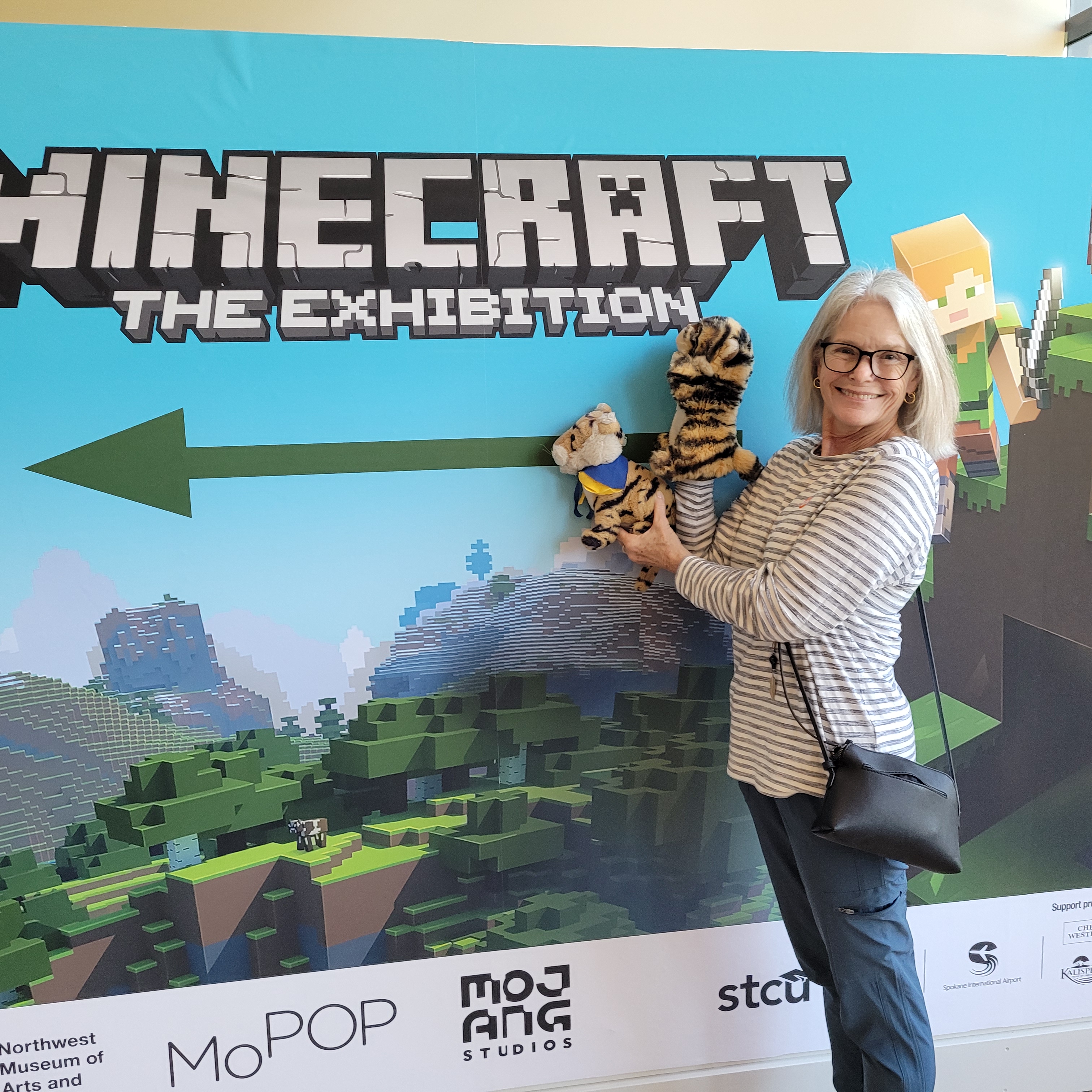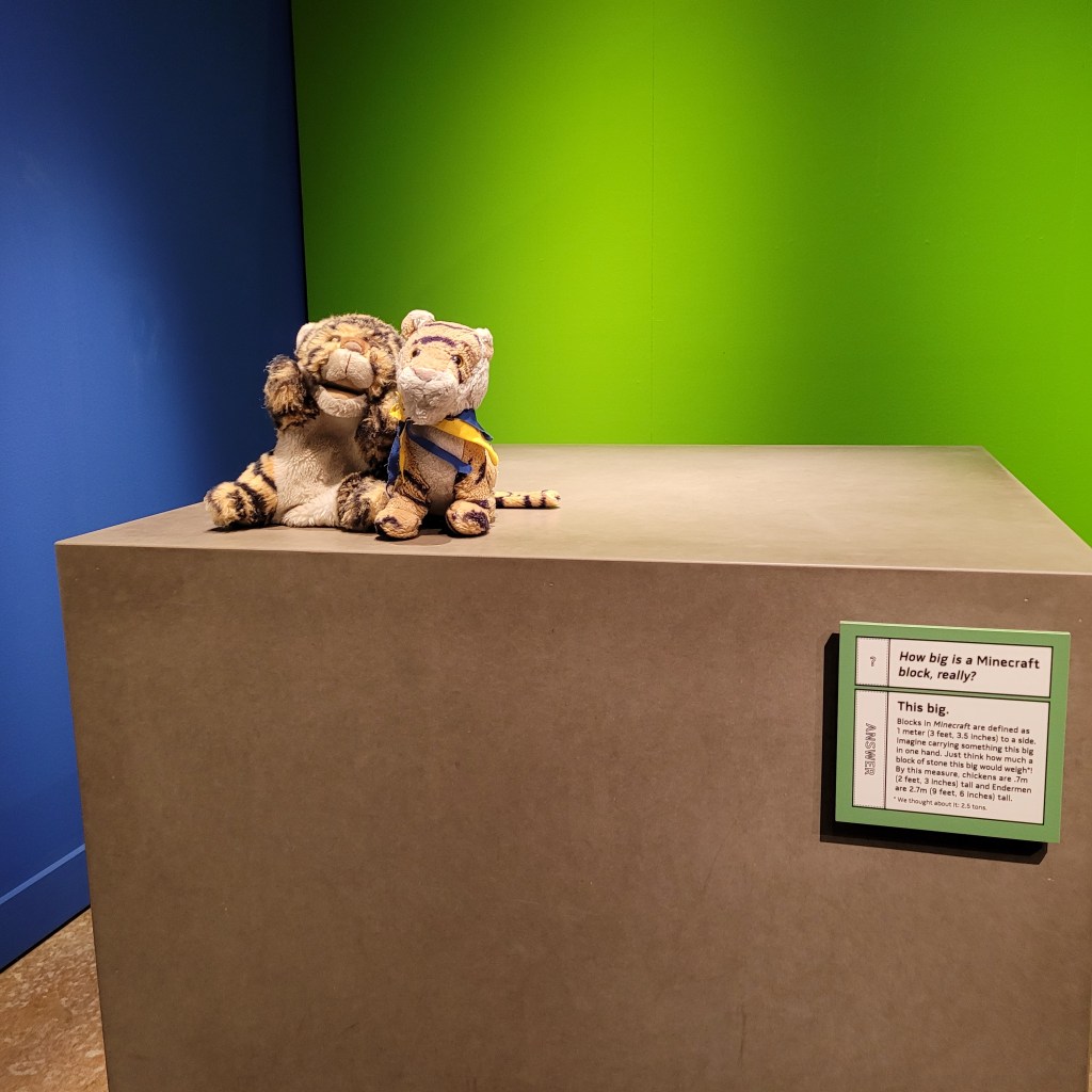 OMG the best thing happened !!! Our cousin Bonita came to visit us!!! She is so nice and so fun and so beautiful!And OMG she brought Cousin Tiger with her!!!!!We went to the giant red wagon and played!Mom had some garbage saved up so we went to see the Garbage Goat! Yayyy!We rode the Looff Carrousel!There is a new playground I had not been to before! There was a SABER TOOTH CAT ride!!!!We went to see The Addams Family at the Spokane Civic Theater!!! Our friend David was in the show but mom FORGOT to take a picture!!On another day we went to Minecraft!! The local museum had an exhibit on Minecraft!This is an actual cube that is the size of a Minecraft block. They are one meter per side.Then we went to a farmers market in the area. Mom bought some potatoes and a watermelon – yum!After that we had lunch at the Mango Tree an Indian restaurant I LOVE Indian food and here I am with Robert our server who was so knowledgeable and super handsome!Oh wow we also went to the Jundt Art Museum on the Gonzaga campus.And then we went to the Big Crosby House and Museum you may not know it but Bing Crosby grew up in Spokane! It was a crazy busy fun weekend! Cousin Bonita and Cousin Tiger are super fun!