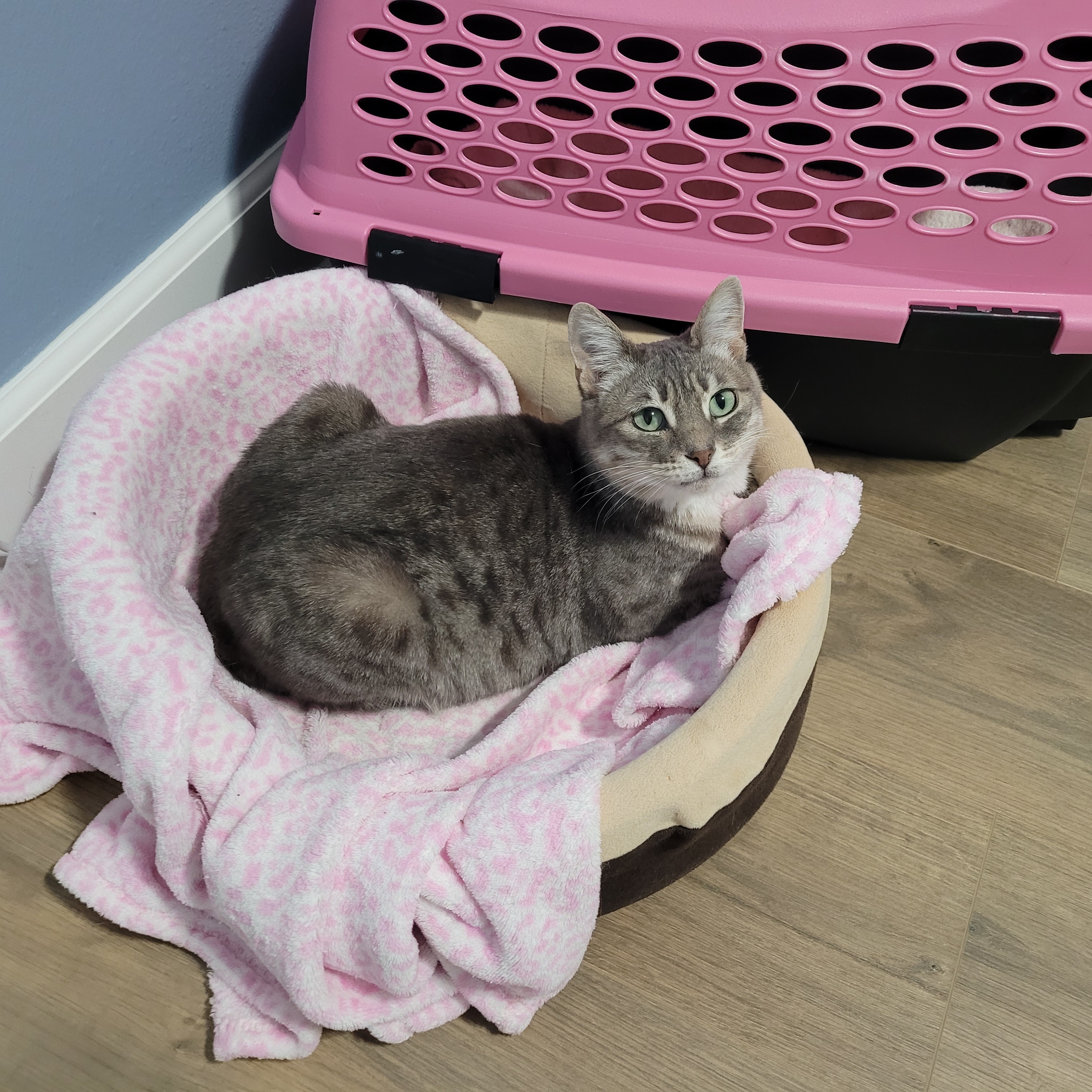 Our local Farmers Market is over for the season. Winter is almost here and the vendors deserve a break! Here is our favorite vegie stand – Tolstoy Farms! We will miss the amazing fresh and delicious produce!Here is one of our new foster cats – her name is Felicity, she came from a hoarder and had some medical issues. Almost all her teeth had to be removed! She is petite and has the sweetest face! So far she has not let mom pet her.Our other new foster cat is orange and white and may be a calico but we have not really seen her yet. She likes to hide in this donut. We’ve seen a little bit of her face and rear end when she is not completely hidden at the back of the donut. When mom leaves treats she eats them shortly after mom leaves the room. So we have hope that she will relax and be friendly eventually.