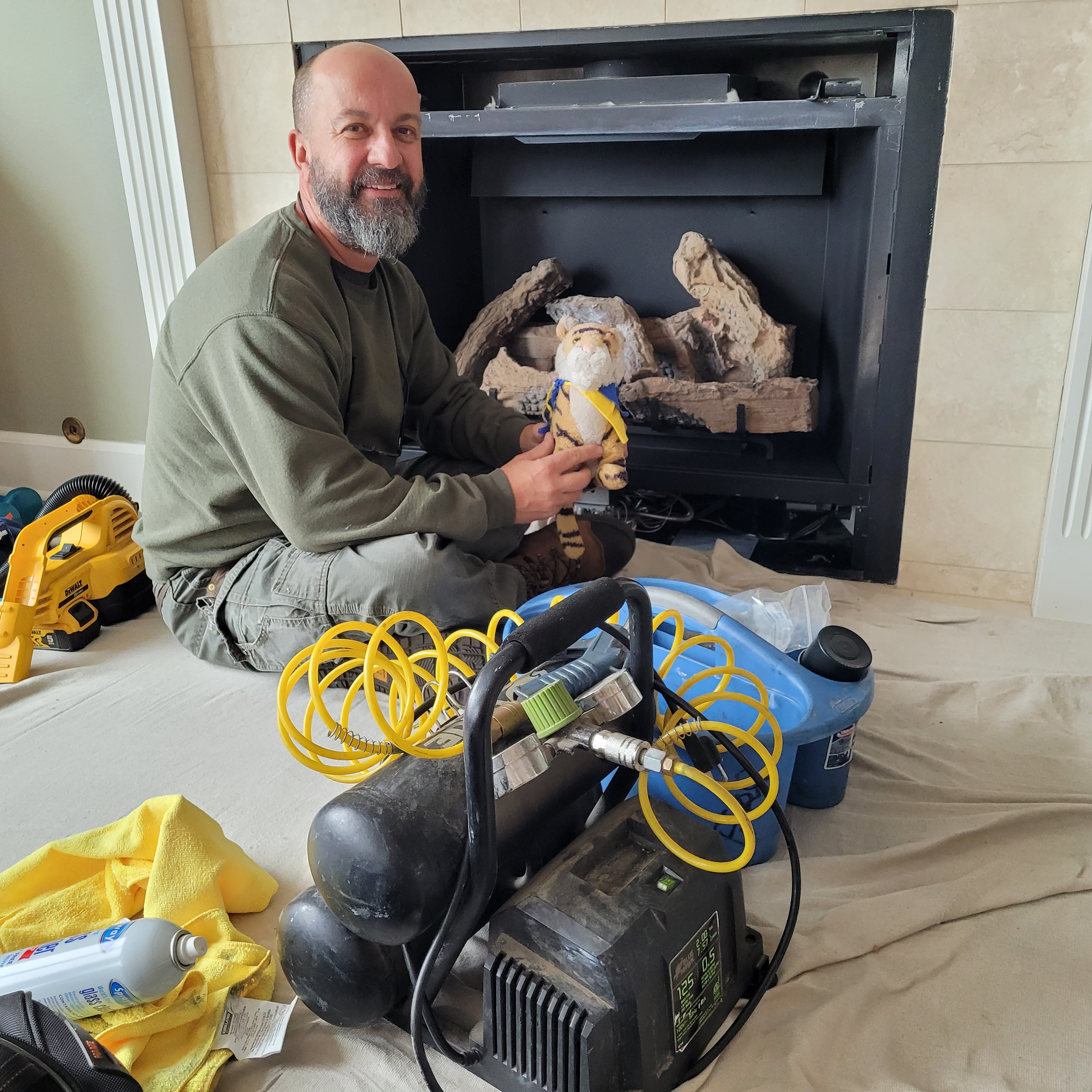 Here I am with John from Smith Heating, working on our gas fireplace. It is running great now! John came out a few weeks ago but never got to work on the fireplace because the furnace had some major issues and he spent the day on that. We now have a new furnace and it is also working great!It is good to have reliable heat because winter is coming or already here depending on your viewpoint. It snowed! And it also gets very cold overnight. Here are some things that have happened recently that mom FORGOT to get pictures of. New furnace being installed. Yasmin had her first visit to the vet and she did great and was brave. Mom got a flu shot. We went to an arts fair and ran into our friends Betty and Dawn. There was a Veteran’s Day potluck at work and mom got a cool tote bag as a gift for being a veteran. Mom made roasted brussel sprouts (ha ha that is a joke, we do not need a picture of Brussel Sprouts!)
