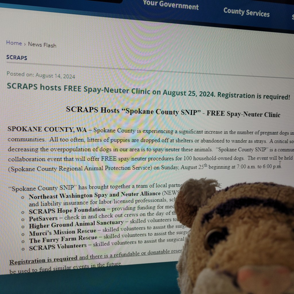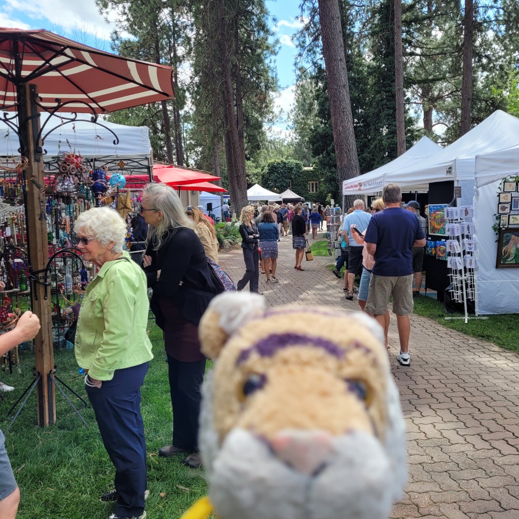 This is Cumulus who is very sweet but is extremely shy and wants to hide most of the time. She was trapped as part of a TNR (trap-neuter-return) program but someone realized she was terrified, not feral. She likes to be petted and purrs and makes biscuits.OMG these adorable fluffy kittens are Ana and Elsa! They were sick and needed 2 kinds of medicine which they did not like. But they got healthy and playful and have been adopted!We volunteered at the first SCRAPS Snip event where 100 dogs (actually I think it was 97, a few did not show up) were spayed\neutered for free! It was a collaboration between 7 organizations, took about 50 volunteers including 3 veterinarians and many vet techs, many hours of work, and more than a little chaos. It was great! Here I am at an arts event on a beautiful sunny day. We ran into our friend Latitia but mom FORGOT to get a picture. The event was at a winery and people could buy wine and drink while looking a the art, so there were people carrying around bottles of wine and drinking haha! I wanted some wine to drink but mom said No.