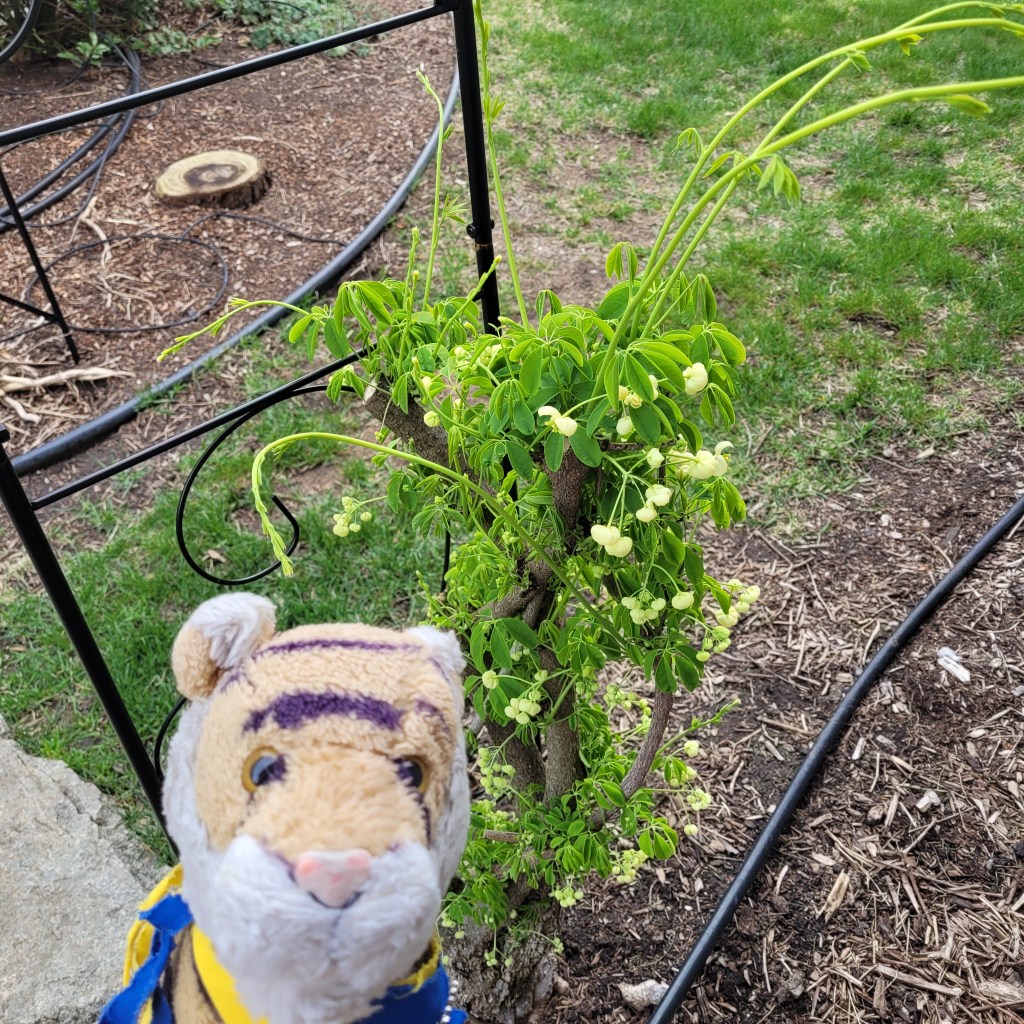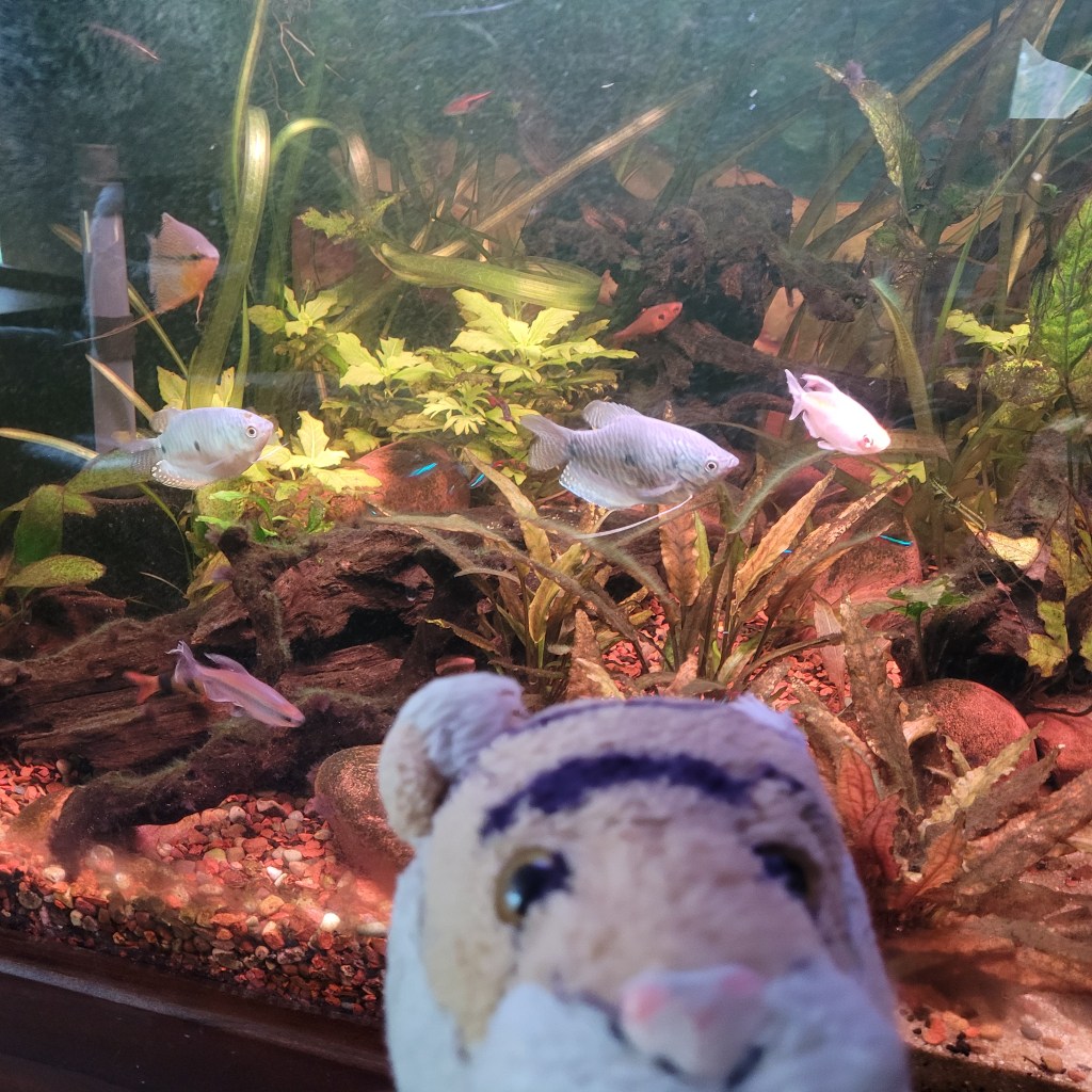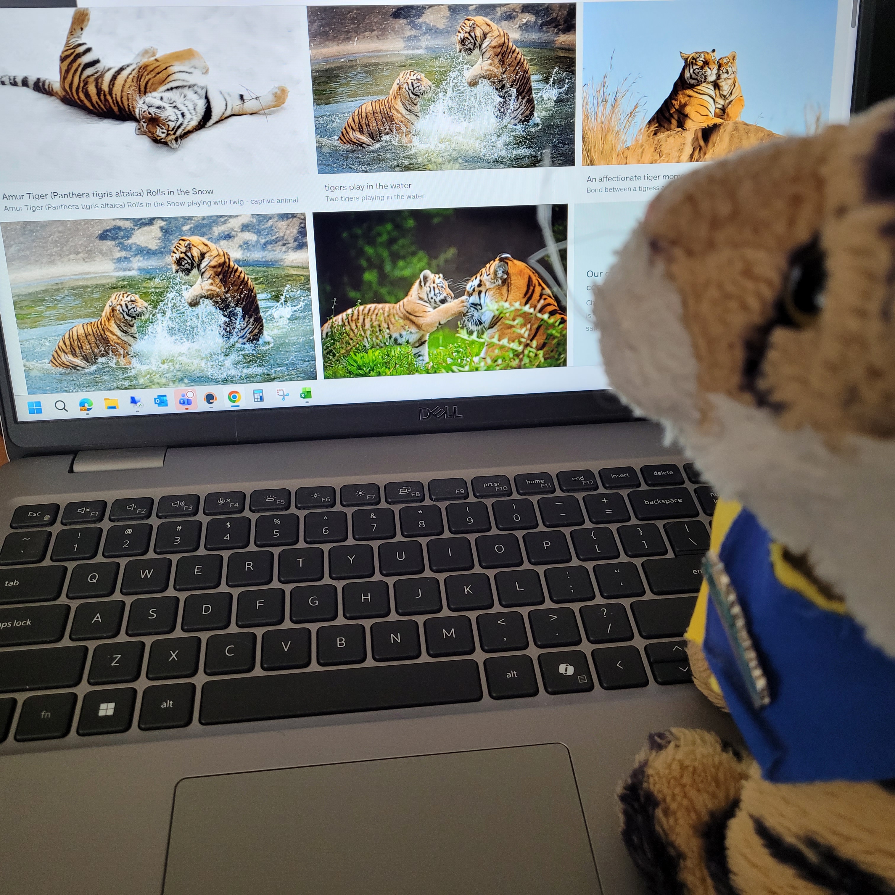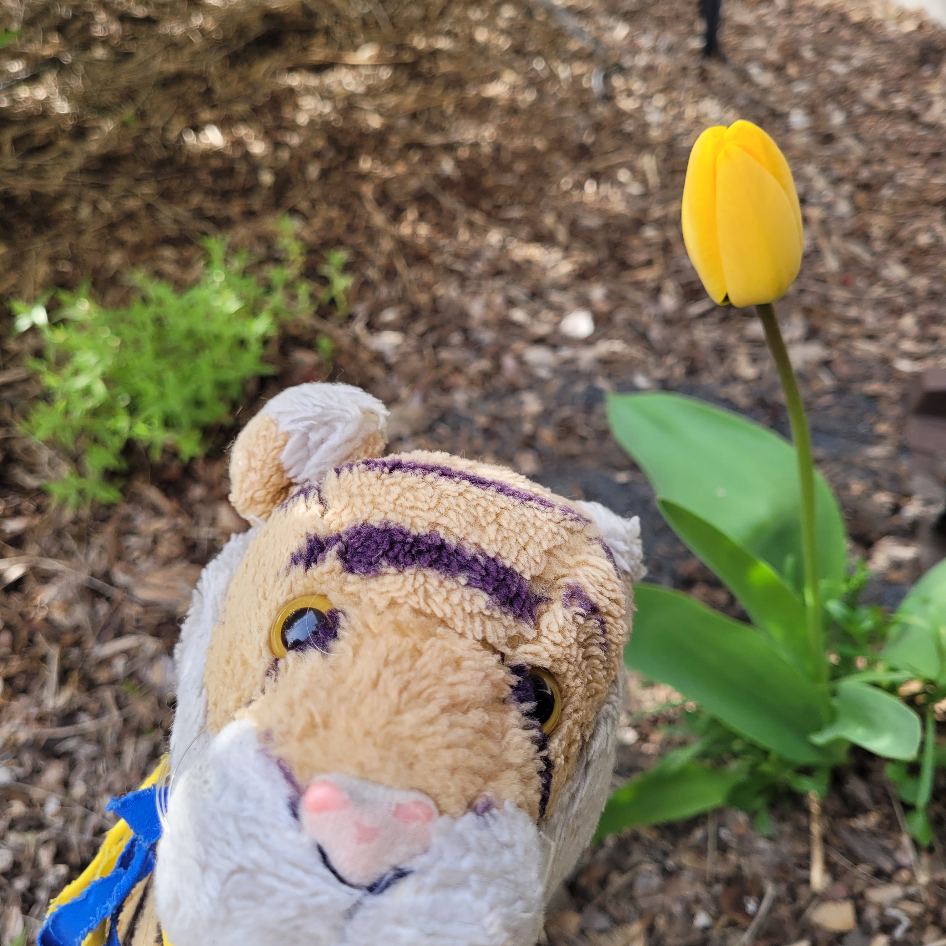 The people that lived in our house before us planted tulips, or one tulip. Maybe they planted a bunch and only one survived. Usually it does not bloom but this year it did!During the winter there was a really big windstorm and the arch between our house and the house next door broke apart and fell over. It was a really heavy duty arch and the honeysuckle growing on it had been holding it up! But after the storm mom had to cut it all down. Then we put in this new lightweight arch but it is supported with rebar that mom hammered into the ground.We have been taking care of our friends fish OMG!!! Our friends have a whole bunch of aquariums and while they are on a trip they asked if mom would look after their fish! Mom used to have aquariums a long time ago and knows how to look after fish. Now she has a Tiger instead which is much more fun than fish.When we walk over to the friends house we take our new Tiger satchel! It is just the right size for a cell phone and it has a little pocket and it came with a really truly small Tiger!For the last couple of months mom has been working on a really big project at work and putting in a lot of extra hours. So that is why we have not been making Tiger blog posts very often.It is best to play quietly or do internet surfing while mom is working. It will be a couple more months before the project wraps up so don’t worry if you do not see a lot of Tiger posts from me! But there are other great Tiger websites to visit while you wait.